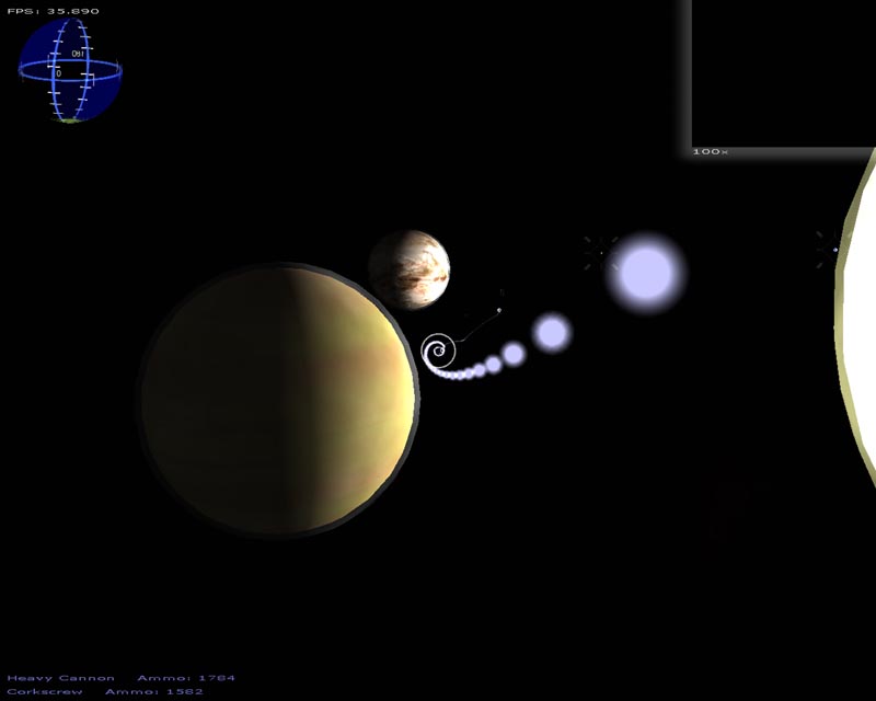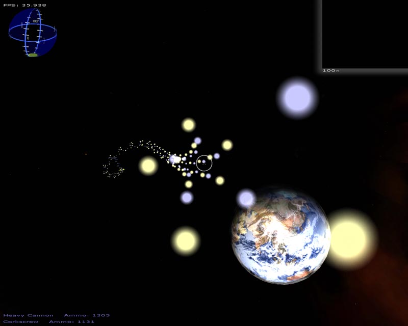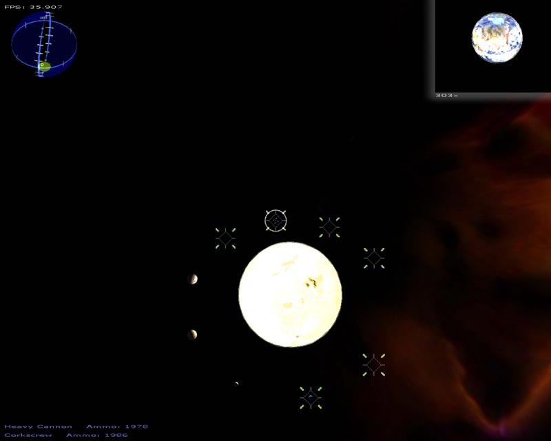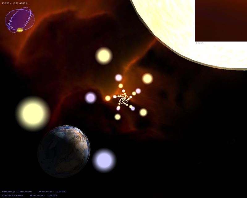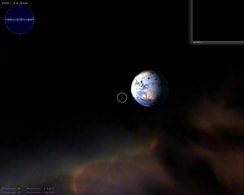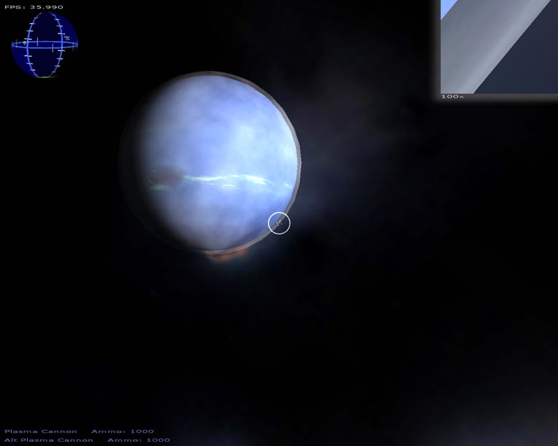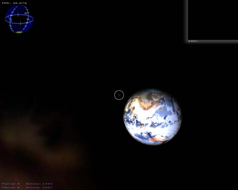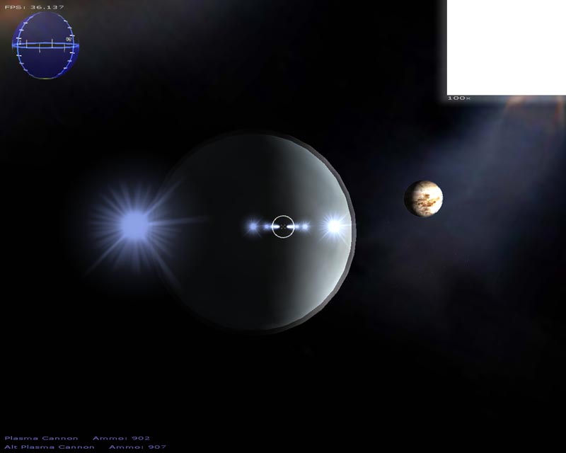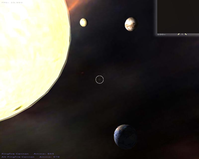 The game (which has turned into a space shooter) has 8 weapons (there will be at least 50 when I'm done). Planets are rendered with atmospheres and correct lighting etc. Gravity calculations are working out pretty well too. It still has a long ways to go but It's not nearly as crappy as it used to be. 3DS models now load correctly, you can alt-tab in and out of the game, there's sound, a pretty cool warp drive effect and a few other things.